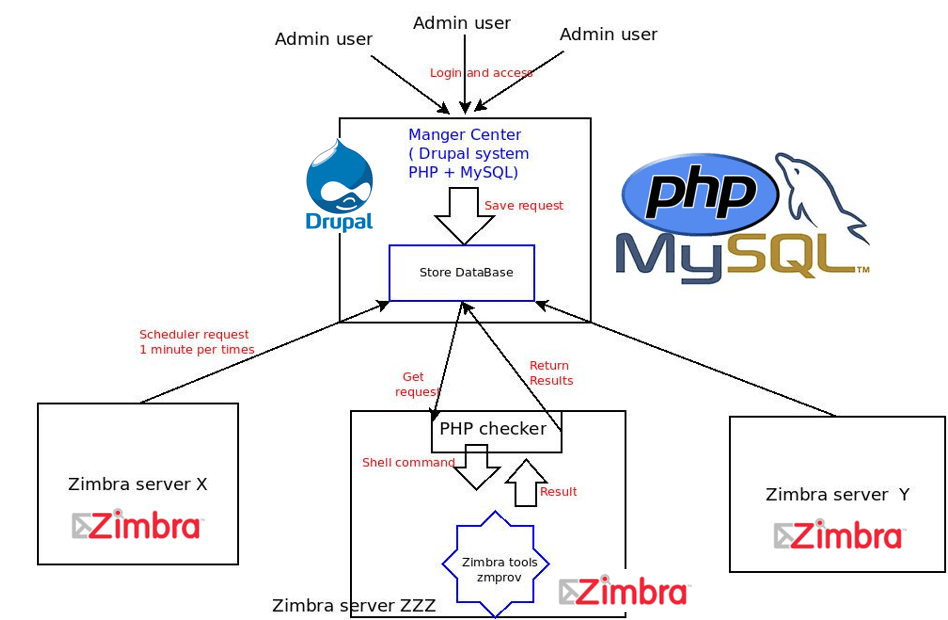 Anyone can control Zimbra with Web Interface in Drupal CMS and everything was kept track in the MySQL database. A command sent by a user from Drupal would go to zmprov, a tool from Zimbra, via HTTP request by the PHP Checker tool.